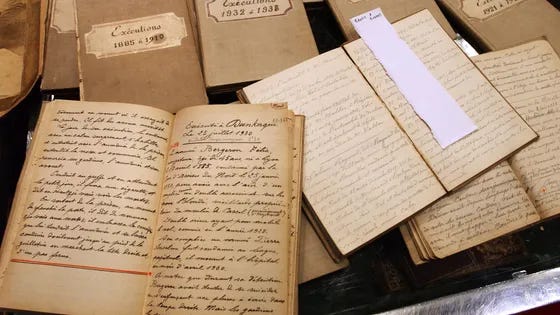 The Monsieur de Paris traditionally selected their own successor. In 1908, Deibler met Jules-Henri Desfourneaux who became one of his valets and later married his niece, Georgette Rogis. After Deibler’s death, it was Desfourneaux who took over as the chief executioner, despite the 200 or so applications that came in to fill the position. André Obrecht, Deibler’s nephew, would hold the role in the coming years and finally Marcel Chevalier, the last executioner of France, who also had familial links by marriage to Deibler and worked as one of Obrecht’s valets. Although not quite the neat dynasty of other executioner families in the past who saw the job go from father to son directly, Deilber did have his descendants carry on his position. As a final legacy, Deilber also left behind something of particular note. Throughout his career he maintained notebooks of all the criminals he beheaded. He detailed their crimes as well as including their mugshots (still a relatively new phenomenon). These notebooks were put up for auction in 2003 and fetched a sum of €85,000.5 Across his career, Deibler performed hundreds of executions - this is the only thing that can be agreed on, since depending on the source the actual number was anywhere between 299 and 400. He was well-respected in his profession, taking no pleasure in the work but committing to it; he saw himself not as a murderer, but rather as carrying out a justice that had begun with jury and judge.