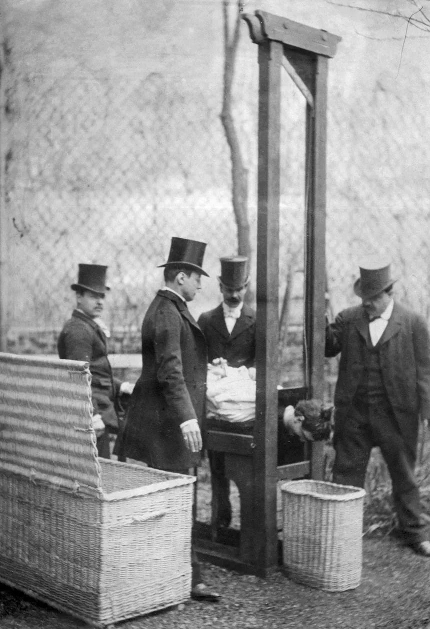 The date of executions were kept secret, with only the judges, prosecutors, and - of course - the executioner being in the know. Despite this, word often got out and large crowds would amass to witness (or, more realistically, hear) what they could of the event. Police would barricade the crowd from direct view, but this didn’t stop the wealthier among them paying to access apartments from where they had a clear line of site. The executioner and his aides (known as valets) were charged with setting up the machine in the earliest hours of the day as executions took place at dawn. They would build the machine as quietly as possible, trying not to alert the prisoners to their fate, and despite the complexity and sturdiness of the machine it took them only about an hour to do so. There was no need for tools as the pieces of the machine were numbered and slotted into each other. Deibler had two guillotines which he had inherited from his father and grandfather before him. One was smaller and lighter, often used for travelling and nicknamed La Fifille (the little girl). The larger, as per tradition, was La Veuve (the widow). Of the component parts the blade was naturally the most important. Deilber took great care of his equipment and even kept the blades of his machines in vaseline when not in use.2 This kept them in much better condition and meant they would last for years with little maintenance needed. The writer Janet Flanner reflected that the blades Deibler used were made from welded steel and bronze that came from Langres, ‘the cutlery center of France’.3 The sharper the blade, the more precise and painless the execution would be, as was the original goal. Once the prisoner was in place, the whole matter would be over in about ten seconds.